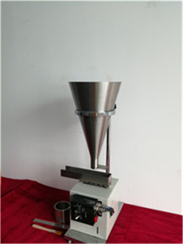 工作原理:將待測(cè)的微粉裝入漏斗,微粉在自身的堆積作用下處于堆積狀態(tài)。當(dāng)電磁振蕩器啟動(dòng)后,微粉在電磁振動(dòng)的作用下,途徑流入測(cè)量桶中,將落入到測(cè)量筒中的微粉刮平,在天平上稱取刮平后測(cè)量筒中的微粉質(zhì)量,再除以測(cè)量筒的容積,就可以測(cè)出待測(cè)微粉的堆積密度